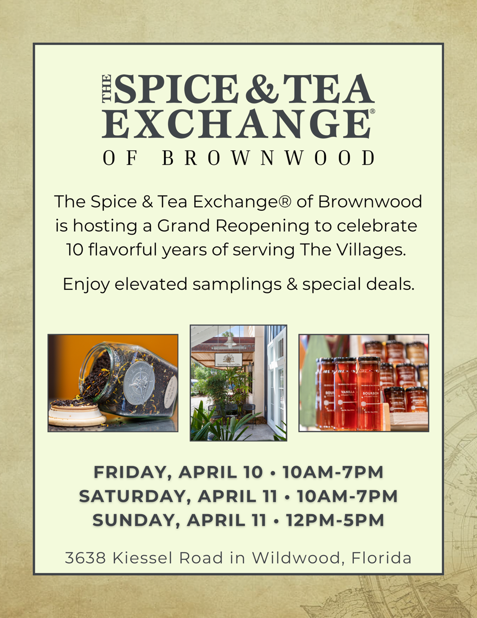WILDWOOD, FL, UNITED STATES, March 30, 2026 /EINPresswire.com/ -- The Spice & Tea Exchange® of Brownwood is celebrating 10 years of serving The Villages community with a new ownership team. Owners Stephanie and Andrew Rush may be new to the Brownwood store, but they are seasoned pros when it comes to running a successful The Spice & Tea Exchange® store. They also own The Spice & Tea Exchange® of San Marco, in Jacksonville and The Spice & Tea Exchange® of Savannah, in Georgia. They will celebrate the store’s 10-Year Anniversary and Grand Reopening from Friday, April 10, through Sunday, April 12, at 3638 Kiessel Road in Wildwood, The Villages.