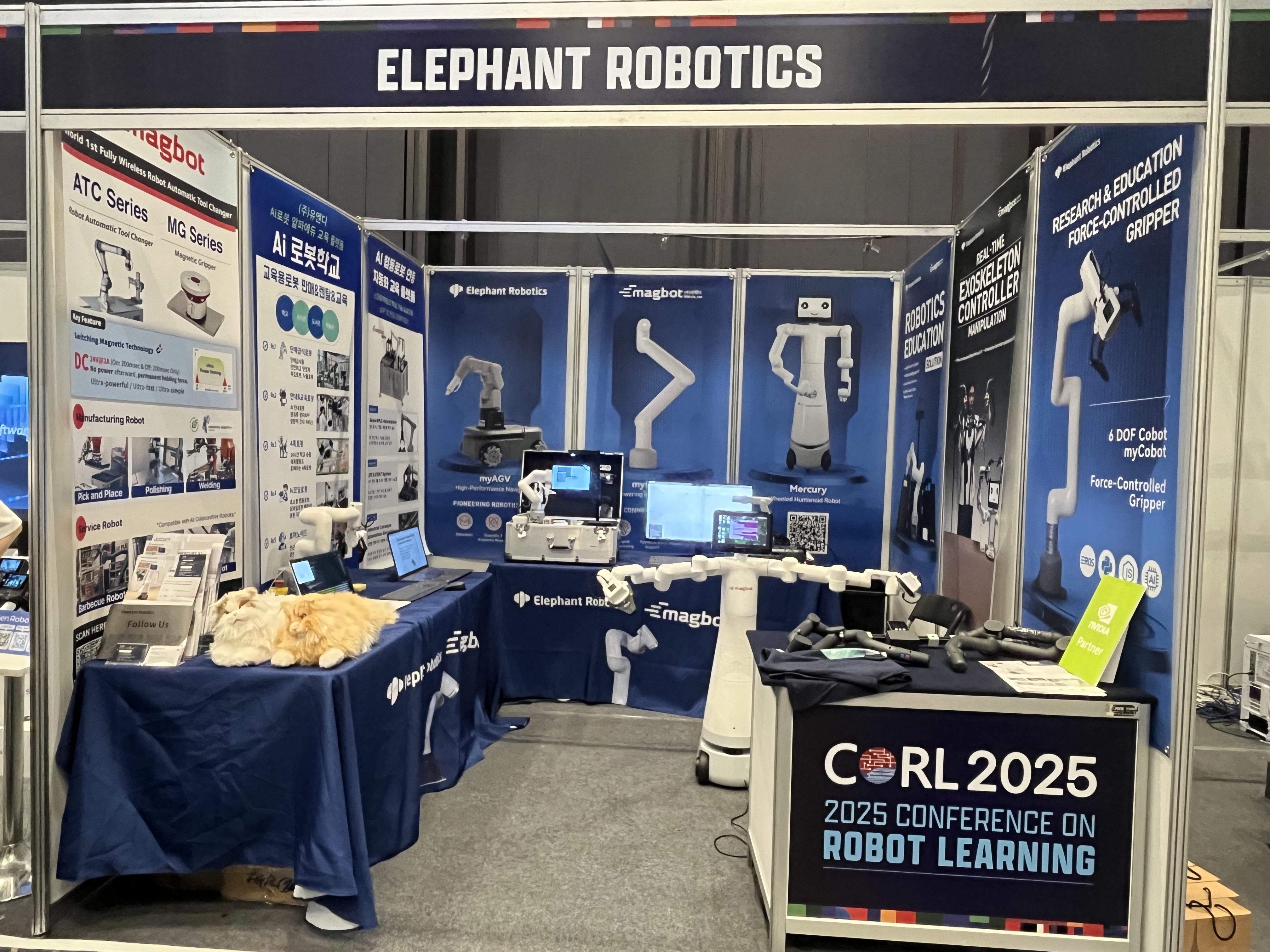 Lastly, at CoRL 2025, Elephant Robotics showcased advanced human-robot interaction (HRI) solutions, featuring the universal wheeled humanoid robot Mercury X1 paired with the wearable exoskeleton controller myController S570, a compound mobile robot combining mechArm 270 and myAGV, and a force-controlled grasping solution with the 6 DOF cobot myCobot 320 and myGripper F100. The innovative wearable controller showcased allowed for precise command over the humanoid robot for various tasks across multiple application scenarios, impressing many academic experts and researchers. The company’s comprehensive robotics education solutions also attracted significant attention from global scholars. Catering to diverse academic needs, the one-step integrated solution combine educational robots with course manuals that can be customized to align with diverse teaching objectives, offering students valuable hands-on experiences to bridge theory with real-world practice and develop practical skills in programming, control, and human-robot interaction—fostering the next generation of robotics talent. A staff member from Elephant Robotics said, "Connecting directly with global users provides invaluable feedback that fuels our mission to create practical, intelligent robots for everyone."