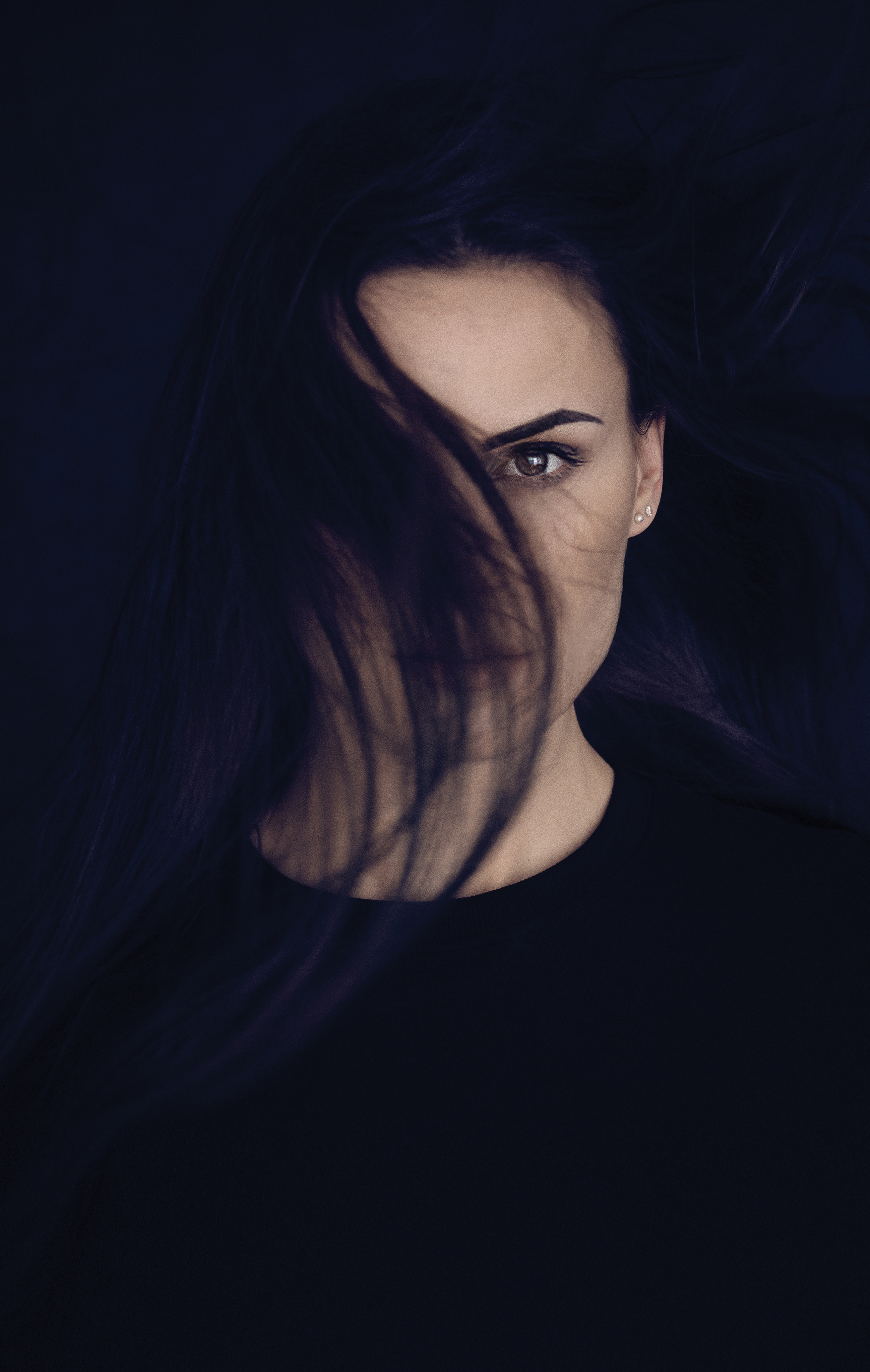 A dark photo of a woman in hiding from a sadistic stalker with her hair partially covering her face.