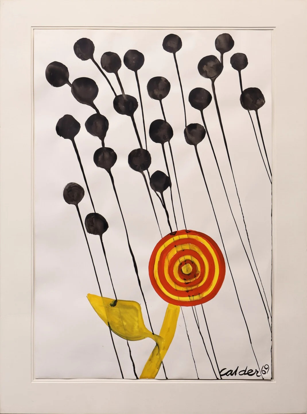 Target Flower presents a bold, graphic composition, its “flower’ formed by concentric rings of yellow and red. Grounded by expressive black ink elements that extend diagonally toward the lower edge. The piece reflects Calder’s masterful interplay of spontaneity and structure, hallmarks that defined his enduring contribution to 20th-century art. This compelling work exemplifies Calder’s distinctive visual language.